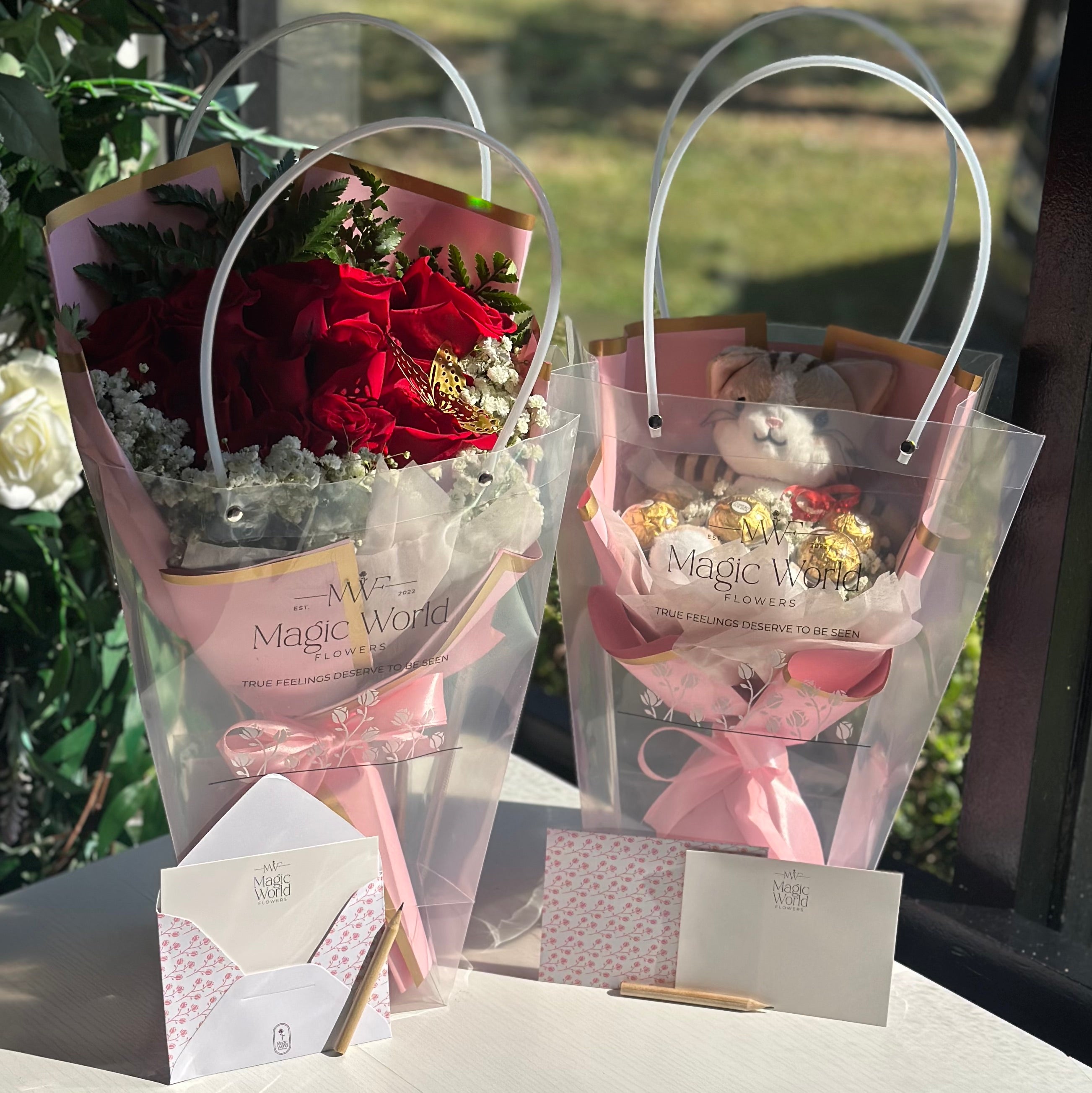 Each bouquet has a survival kit (they come with water) to keep them thriving until you gift them. At home, care should involve: Trim the stems by 1 inch, provide clean water, keep away from heat/sun, and shower with love 💕.